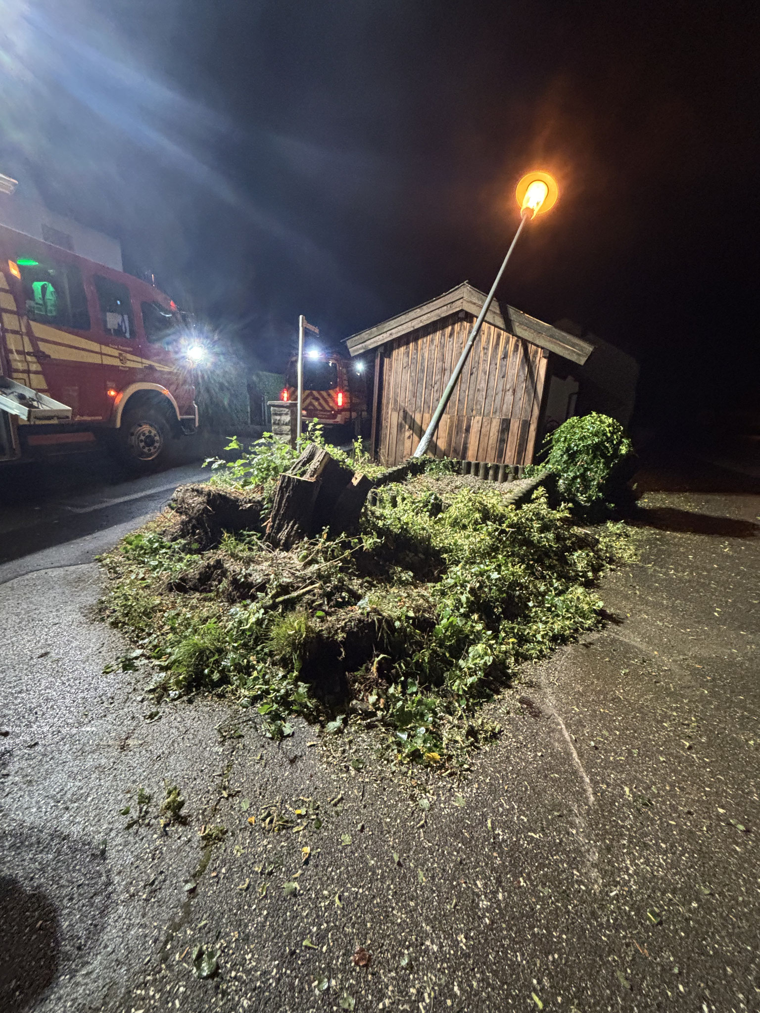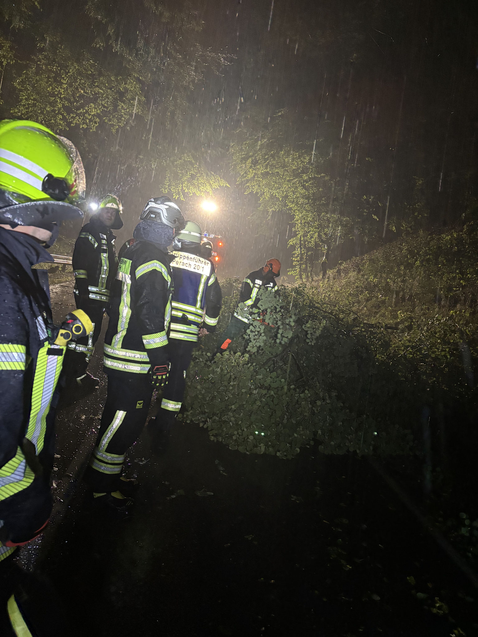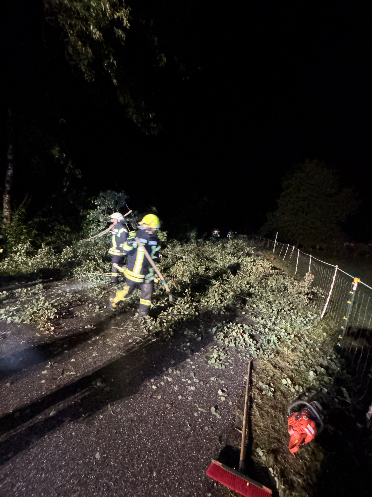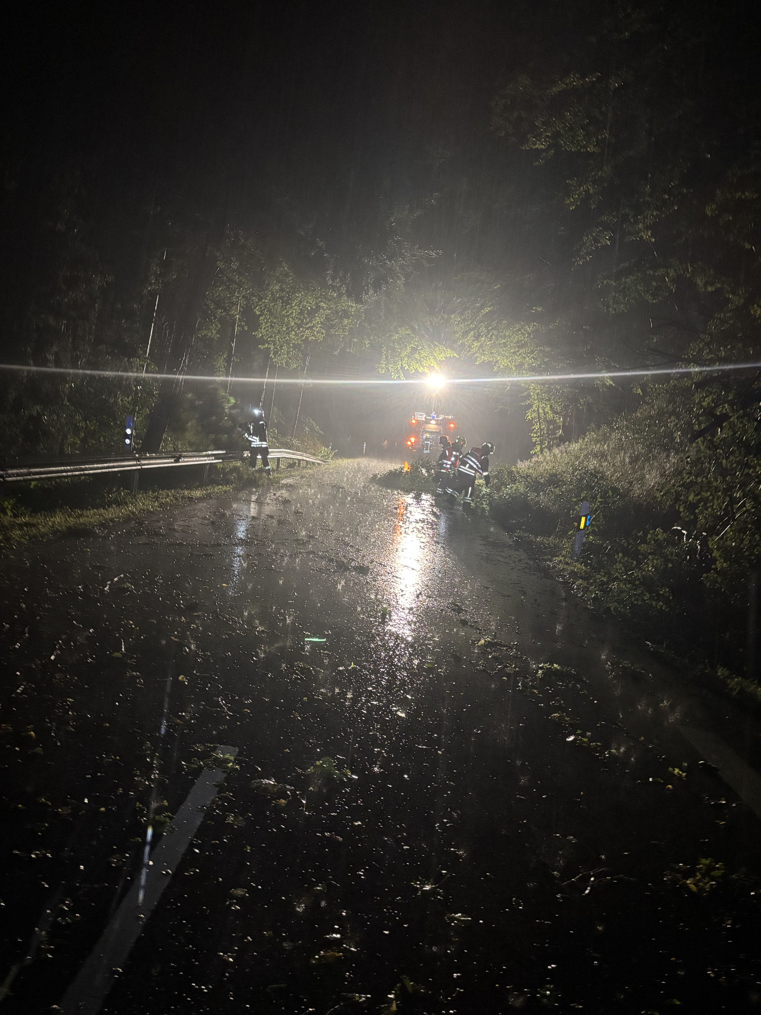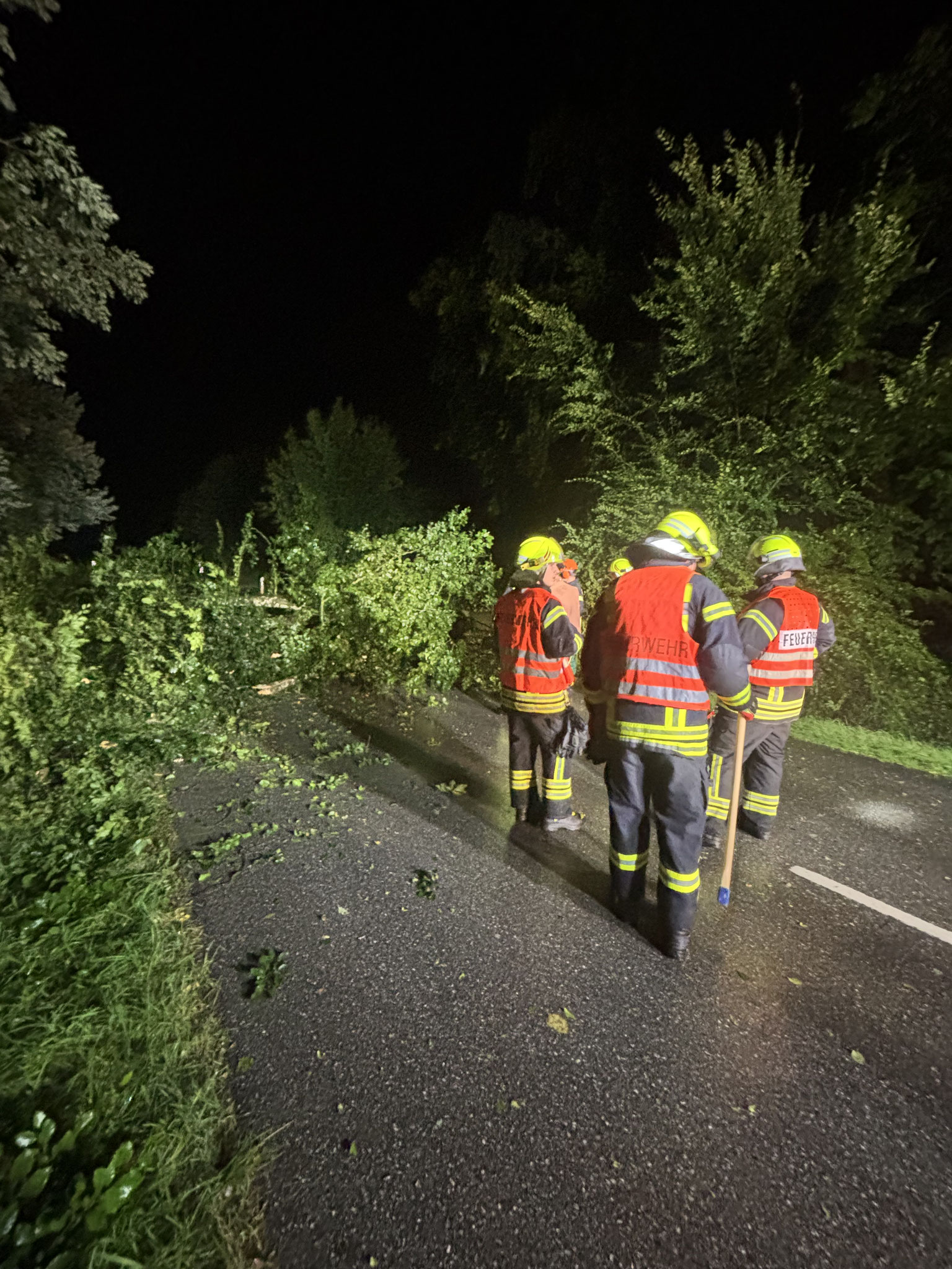 Freitag Nacht wurden wir bei einem heftigen Unwetter zu einem Baum über die Fahrbahn alarmiert. Wir stellten im Anschluss im gesamten Ortsgebiet mehrere Bäume über den Straßen fest. Bis 5 Uhr morgens fertigten wir mehrere Einsatzstellen ab.